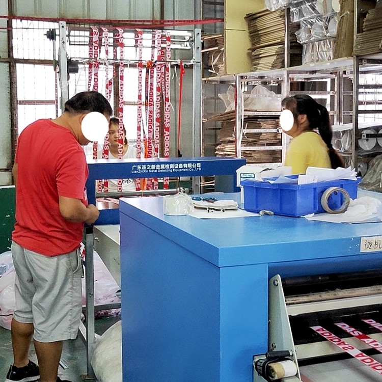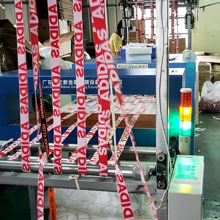 Adidas织带供应商之一某利纺织公司在其定影机前加装连之新织带检针器检针机,用于严格把控金属异物,对于极细小的金属屑哪怕0.5mm细小的金属也必须不能放过。连之新工程人员将检针机通过技术手段现场给客户装配到他们现有的生产设备上,不额外占用地方。客户很满意!